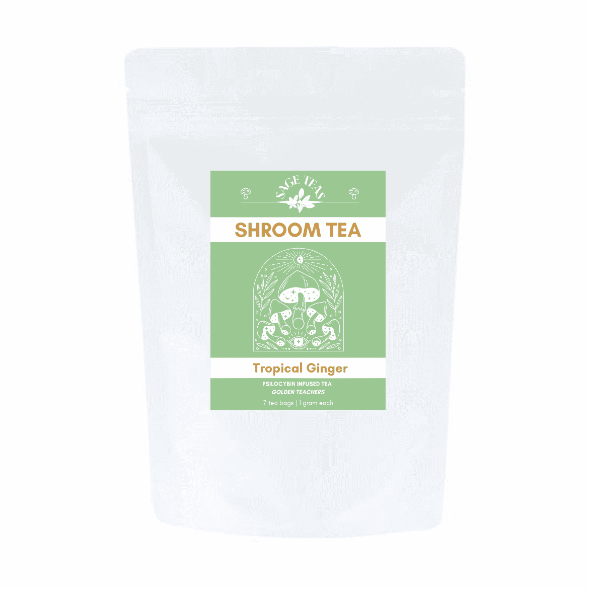 tropical ginger golden teachers shroom tea from our friends at sage teas has your shroom tea needs covered. there are 2 options for dosing preference. each product contains 7 teabags, but you get to pick the dose! you can choose the 500 mg option, which is more of a microdose option, or the 1 gram option for a higher dose and a bit better value to the price. if you are looking for an even more potent experience or consuming with a bunch of friends, just add more teabags into the mix!